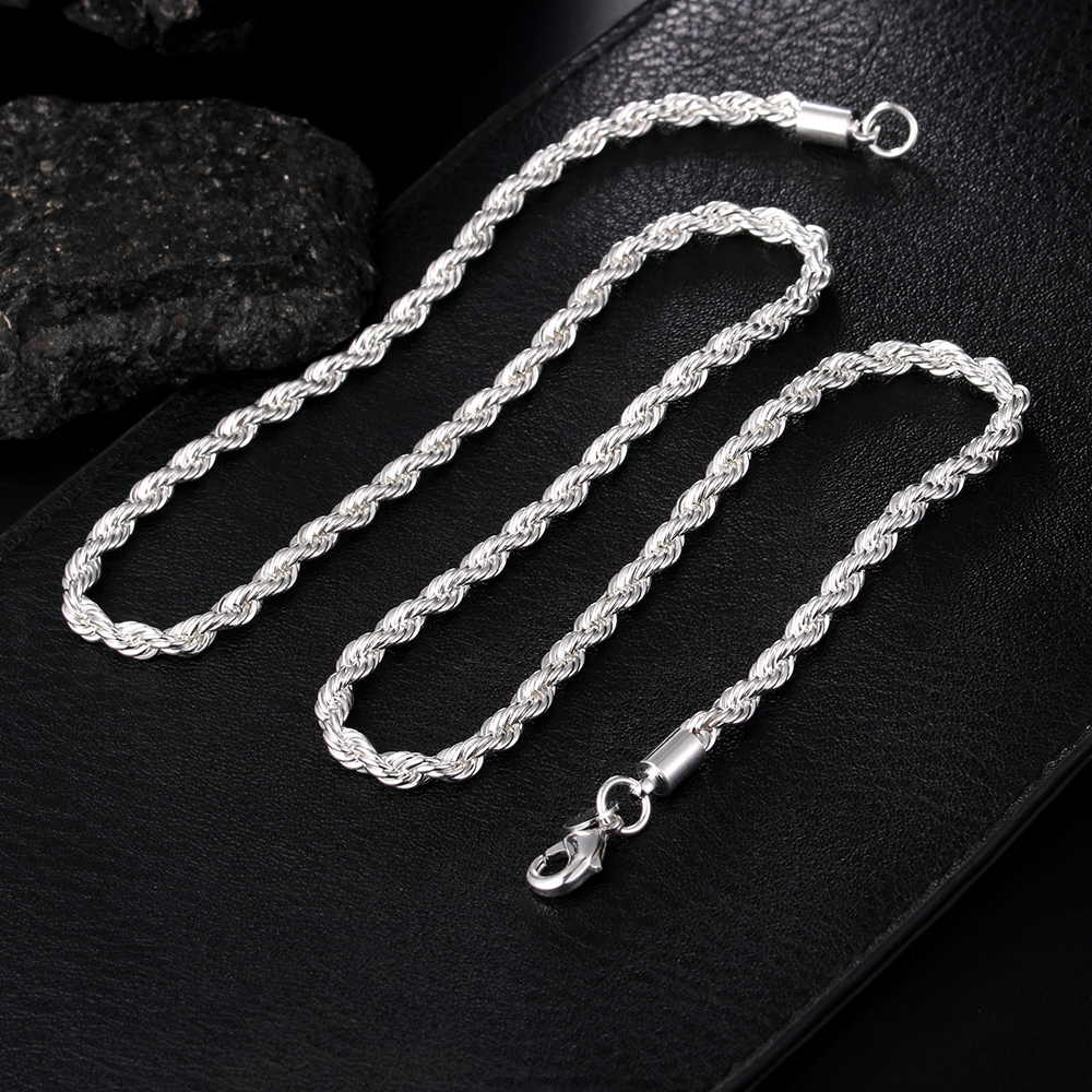 fecify fecify high quality 925 silver color 4MM women men chain male twisted rope necklace bracelets fashion Silver jewelry Set