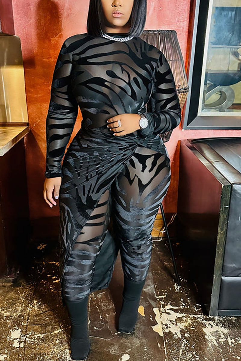 fec Xpluswear Plus Size Black Party Animal Print See-Through Mesh Long Sleeve Wrap Skirt Jumpsuit Set [Pre-Order]