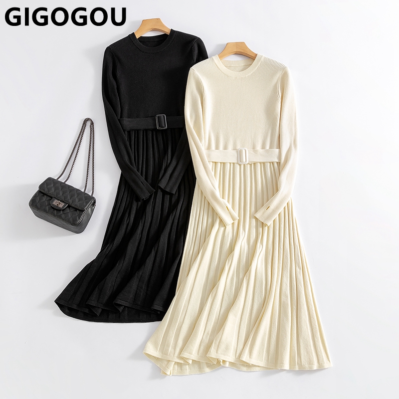 fecify GIGOGOU Chic Long Knit Women Maxi Sweater Dress O Neck Winter Thick Warm A Line Dresses with Belt Woman Pleated Midi Dress