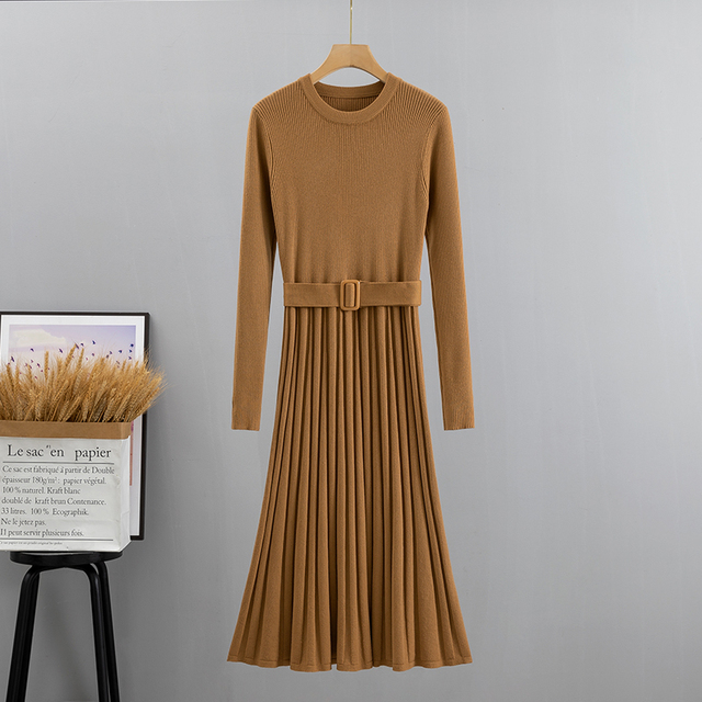 fecify fecify GIGOGOU Chic Long Knit Women Maxi Sweater Dress O Neck Winter Thick Warm A Line Dresses with Belt Woman Pleated Midi Dress