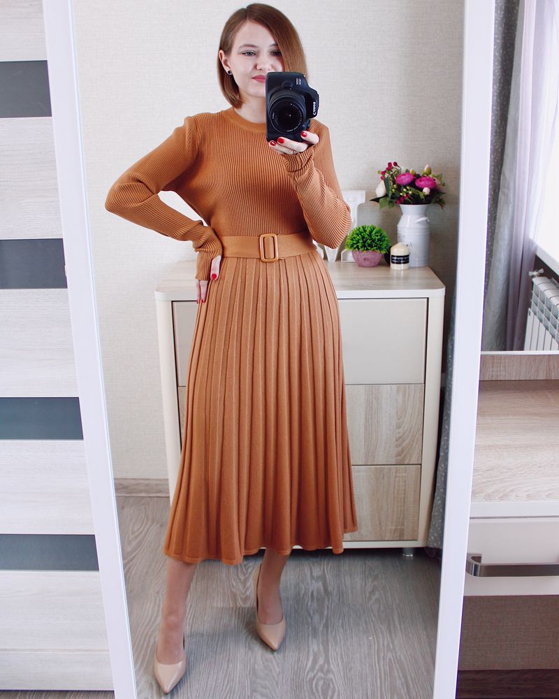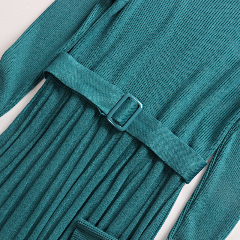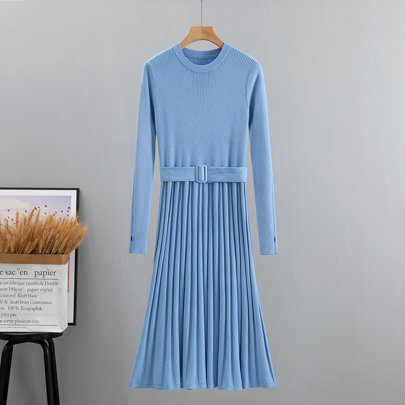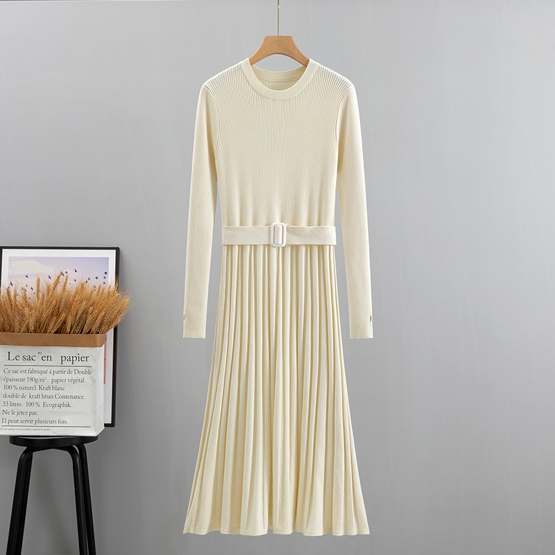 fecify GIGOGOU Chic Long Knit Women Maxi Sweater Dress O Neck Winter Thick Warm A Line Dresses with Belt Woman Pleated Midi Dress