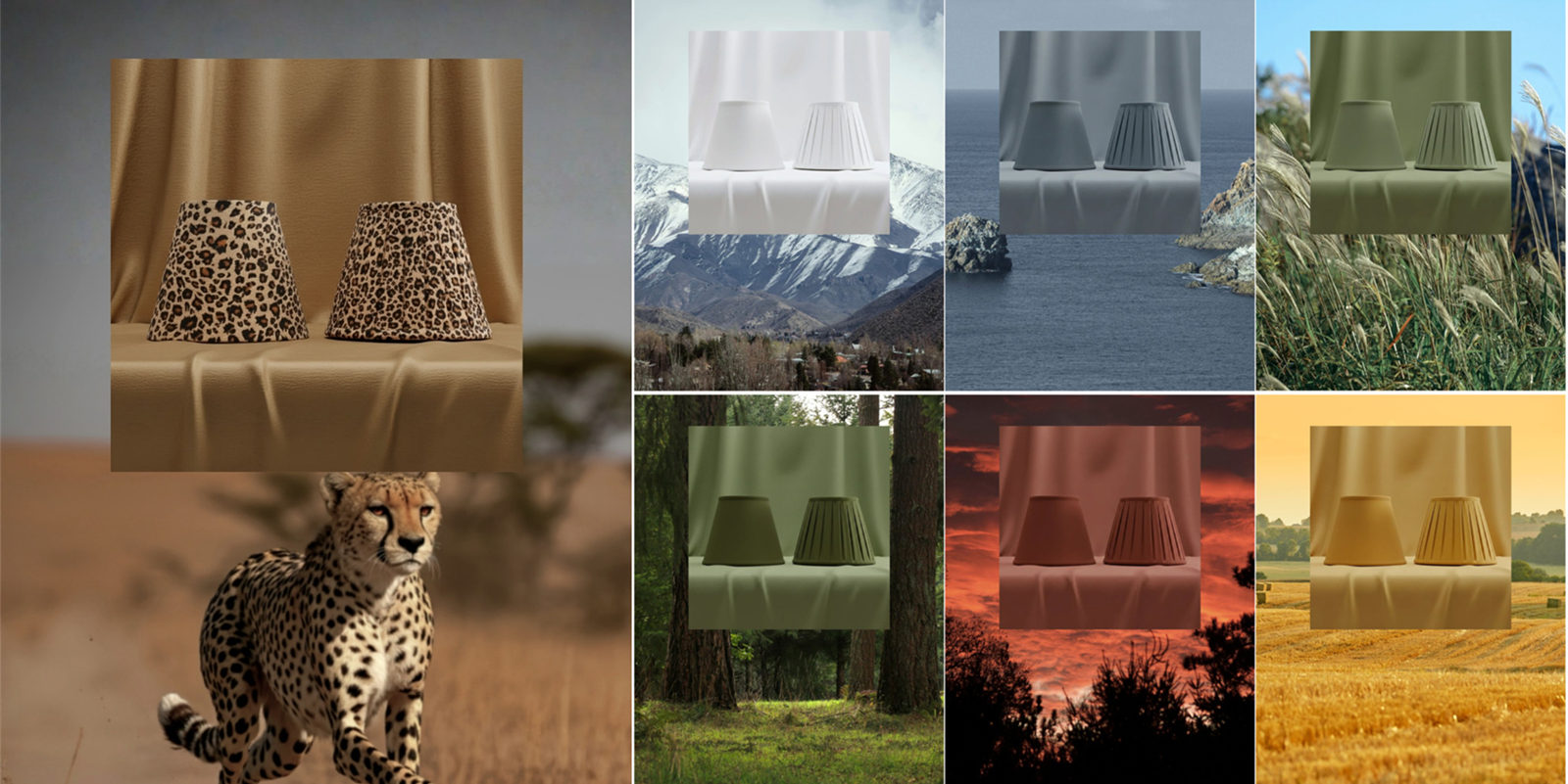 Retro Nature’s Embrace, Serene Snowscape Light, Coastal Blue Glowand shores, Fresh Green Plant, Sunset Red Warmth, Leopard Hunting Silhouette and Golden Harvest Moments — each shade captures a moment of natural beauty and turns it into warm, peaceful light for your home.